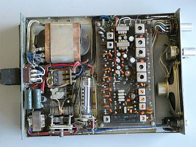 こちらは、Marker 66の内部です 受信基板と送信終段が見えます ハイブリッド構成で、終段は真空管6360です 受信のフィルタは、東光の24KHz巾のメカニカルフィルタが採用されています(本式!) 送信基板が見えているほうのリア側は電源部です 改造・欠品は無さそうなのですが、電源が入りません リア側の状態が悪く(保存状態が良くない)、標準の2Aのヒューズでは飛んでしまいます 試しに5Aのヒューズを入れたところ巻き線抵抗から発煙・・・ 基板は、ガラスエポキシ風で劣化は見られないのですが残念! トランスがNGかな・・・です 回路図が入手できれば、もう少し手の入れようがあると思います |