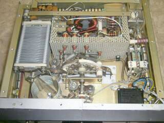 本体ボトム 非常に小型に作られています 電源は、別筐体(セパレート)です ヒートシンクによる放熱とはいえ、スケールファン程度の厚さの小型シロッコ風ファンを内蔵します 下パネルに取り付いて、それを外した状態ですので写真には写っていません スケールファン程度の風量で、シャーシ下から上に向かってヒートシンクの隙間(谷間)を風が流れるようになっています タンクコイルからバンドSWへの配線部分から風が漏れないよう、絶縁物で囲ってあります(写真中央で、白く見える板がそのもの) |