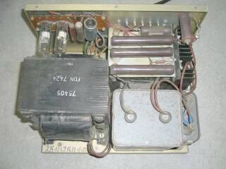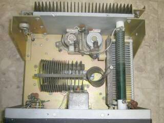 最後に電源部 さすがに重い! 蹴飛ばすとこちらが怪我をしそうです 整流はブリッジ・ダイオード、スイング・チョークにオイルコンデンサという出で立ちです 真空管に見えるのは、サーモタイマ(遅延リレー)です |