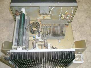 こちらは、本体トップを後ろ面から 入力は、バンドごとに用意されたLPF(上写真) 出力は、πLで、Henryお得意のスタイルです(バリLではありません/アマチュアバンド専用) 右下がアンテナ出力端子で、その下の白いケース部分はSWR検知部です リアパネルの大きさは、ヒートシンクで決まったようなものですね 小型・・・このRFデッキサイズは、3−500 1本分くらいでしょう、これで2Kw入力ですから、体積あたりの効率は抜群ということになりますね、きっと |
