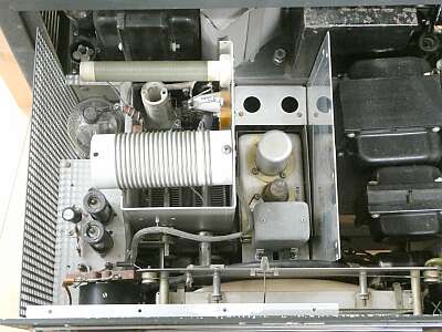 大きなシールド これは前オーナーの手による加工と思われます この左サイド、冷却ファンの下が終段で、その手前パネル側に前段が続いています 全体の中央あたりにVFO発振管6SJ7が配置されています 右上:高圧整流管は、ダイオード(ソケット組込)に置き換えられています 右サイド:変調器部 807が2本見えます 電源トランス、チョークトランスx3、変調トランスと重たいものが一杯載っています |