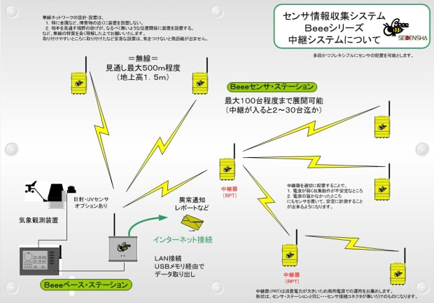 | ・センサ・ステーション 〜 ベース・ステーション間の、電波飛距離の目安は最大500m程度 |