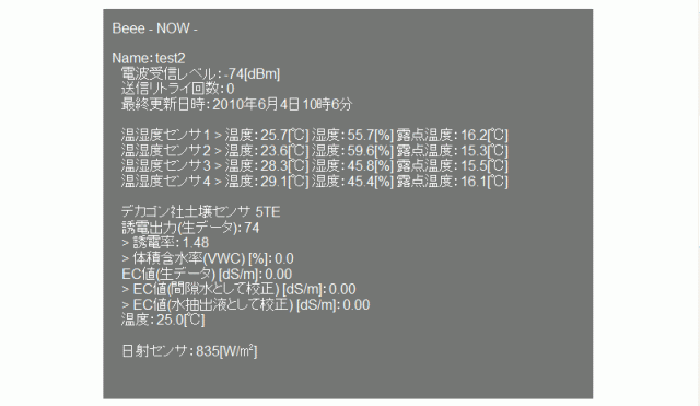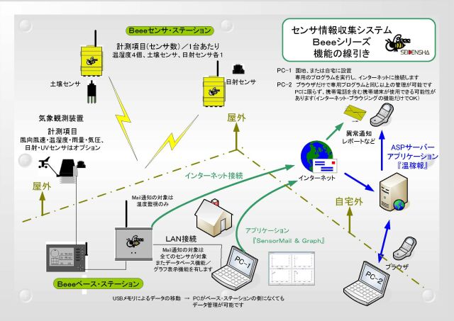 私どもは、露地栽培を中心とした専業農家の方を対象とした気象観測システムの活用を進めると言うことで、取り組んでおりますので、こちらでご紹介の【Beeeシリーズ】は、その役目を終えたと判断し Davis VantagePro2シリーズ を活用する方向でシステムの構築に注力させていただきます(2015) |