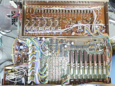 TopにCATV用Tr(2SC1426:受信のトップながら、ヒートシンクが取り付いている!)、MixにはDBMを採用、その出力には16KHz巾のフィルタを採用(FM時の選択度は、これで決まる)したシングル・スーパー構成で、当時としてはかなり高いダイナミック・レンジを得ています