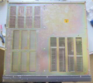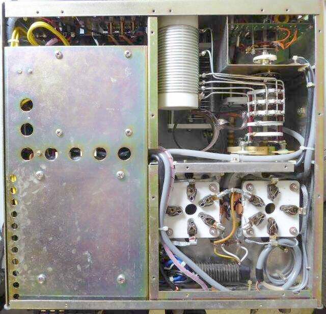 ![]() ボトム:RF側(写真右側)にはシールド板が取り付いてあり、そのものを外して撮しています 左に見える板に4本ずつ配置されたビスは、高圧トランスとフィラメント・トランスを取り付けるビスです |