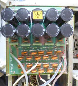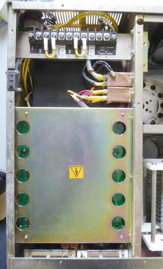 キャビネット上蓋を外すと、まず見えてくる景色はこのようになります 全体を囲う1枚のシールド板です 保安SWを押すような構造も用意されています 1.AC電源がONできない/強制OFF 2.チャージされている高圧をグランドに強制ショート このシールドケースを外すと以上の制限がかかります シールド板を外すと上から2枚目の景色となります |