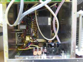 ![]() トップ側:全体を覆うシールド板があります、それを外して撮しています シールド板を外すことで、電源を切ってしまうSWと、高圧をグランドに落とす機構が見えています 空冷は、本格的なチムニーの採用ではなく、スケールファンを採用(3-500Zは、取り外しています) |