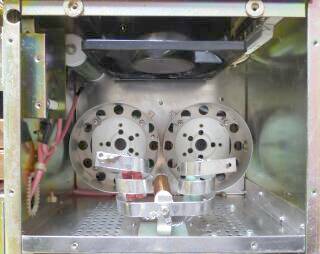 本体半分の後ろ側、真空管の収納される部分です 左上の金物が、シールド板を外すと高圧部がグランドに落ちる機構です その右に見えている大型のホーロー抵抗は、高圧回路に直列に入っているのです ラッシュ電流の制限でしょうか? 冷却は、スケール・ファンが採用されており、150秒のOFFディレイ回路が組み込まれています HENRY-3KAなどハイパワーを目指すものは、チムニーを採用、ソケットの下からブロアーで吹いています DRAKE L-4Bでは、静音を目的にチムニーを使ってあるようです |