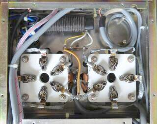 上写真の両端に穴の空いた板を起こした状態です 高圧の整流基板が載っています ダイオードも2.5Aタイプと大きいものが採用されていますし、平滑コンデンサも10個と、モデルあるいは製造時期による違いがあるのかも知れません 手元のHL-2Kの説明書では、ダイオードは1A型、平滑コンデンサは500WV 8個の構成となっています(本機は、450WVだったかも・・・) この手のアンプの電源では、半波倍電圧整流回路の採用が多いのですが、このものは全波ブリッジ整流回路が採用されています レギュレーションは、間違いなく良いと思います |