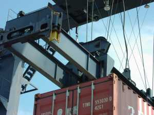 コンテナにタグを取り付け、読み取り試験を行っている様子