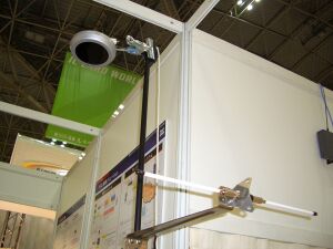展示会場には、6組のRFcode Spider IIIA + 今回のために当社で用意した平面アンテナ(パッチ風アンテナ) + アンプを設置して、ユーザーがかぶった帽子に入れたタグ(各帽子には 4つのタグを入れています)を認識して、その場所とユーザーに応じて、(展示品に関する)音声解説をするというものでした。(右上の会場レイアウト参照:黄色の長方形が平面アンテナの設置位置、赤丸がユーザーの立ち位置です)