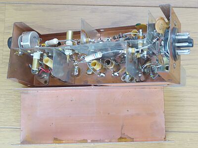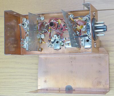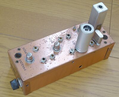 50MHz帯用受信コンバータ こちらは、局発(6J6)以外、ニュービスタ6DS4/6CW4が採用されています(RFアンプx2、MIx1 計3本) 同じシリーズで、144MHz帯/220MHz帯用のモデルがあります このモデルには、RFゲイン調整VRがあります CBシリーズの上位バージョンかな? Hallicrafters SX-101Aなどコンバータ入力が用意された受信機を意識したのでしょうか、30.5MHz〜34.5MHzに変換するクリスタルの用意もあるようです 構造、配線とも上手くできています 余談ですが、銅メッキされたシャーシは、まるでDRAKEの製品を見ているようです |