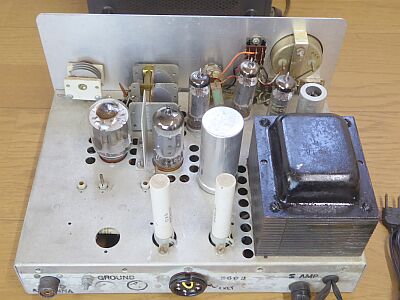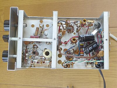 50/144MHz帯 2バンド送信機 CWで最大入力75Wの、アメリカン・ノービス級向けのCW/AM送信機です AMでは、多分75W入力は困難かと思われます(CWの半分程度かと) AC電源内蔵にもかかわらず、非常にコンパクトです 8MHz台のFT243クリスタルを使用 50MHz帯は6逓倍 144MHz帯は、なんと18逓倍です ※VFO-621からは、2逓倍、6逓倍です ファイナル管は、7984という当時最新の175MHz以上でも使える車載を意識したコンパクトロンです 構成は、極めてシンプル OSC・x3/6GK6 x2/6GK6 バッファ/7868 終段7884 => 50MHz帯 OSC・x3/6GK6 x2/6GK6 x3/7868 終段7884 => 144MHz帯 変調は、スクリーングリッドを使ったクランプ管変調 興味深いのは、ドライバ7868の使い方 ひとつよくわからないのが終段管の傍からリアパネルに向かっている銅線 どう見ても後付けされたものです 中和ロッド風にも見えるのですがそうではありません なにか出力を検知するために前オーナーが追加したものでしょうか??? 天板にあるスケールファンも、前オーナーの手で取り付けられたものです 細く立っている2本のもの 抵抗器です、一見ブロック・コンデンサに見えますが・・・ |