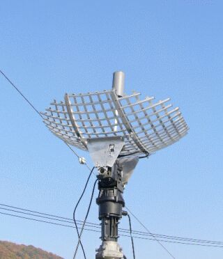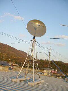 なんか間抜けして見えるは気のせいでしょうか!? 大阪万博(古いなぁ、1970年ですよ!)を思い出して??かな 屋上の、1.8m高のルーフタワーに設置した全景です 手前に見える斜めに張った線は、グラスファイバーロープによるルーフタワー固定用の支線 奥に1本見えるのは、電柱間に張ってあるステーです |