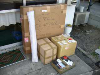 航空便で輸入したままの梱包をご覧に入れます 大きな四角の箱は、パラボラアンテナの面が入っています φ90cmとのことですが、φ100cm位あります 縦の白い梱包は、1m長の支柱です 手前の黒っぽい箱の中が、ポールのスタンドになる金具が入っています(一番重たい!) 真ん中の列の右側に見える箱は、2軸制御のローテーターがケーブル20mx2本と一緒に入っています 真ん中の箱に、主要品・・・アンテナヘッド、ヘッドアンプ、受信機、PCインターフェイス(USB)、トラッカー(2軸制御)、そしてソフトウェアが入っています |