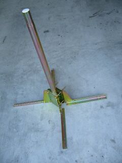 こちらが純正の設置スタンドを組み立てた様子です 長さ1mの支柱の上に、回転装置、アンテナを取り付けて設置するためのものです 無風なら自立するかも知れません!! 今回は、屋上に設置 高さ1.8mのルーフタワーにこの支柱だけを使用して取り付けました |