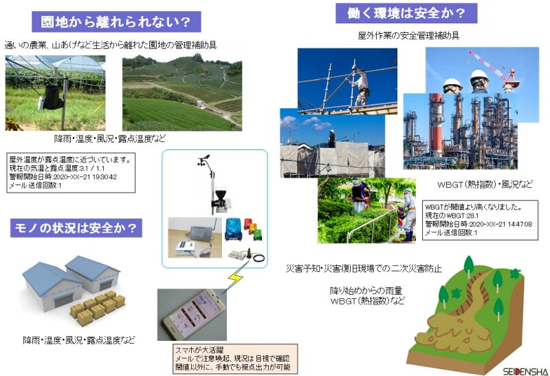 | 気象情報を遠隔でモニタあるいは、その場で作業者に注意喚起など 現場・現地で気象観測を行うことで、その場に直結した 1.作業現場の安全管理 2.育成物や製品の管理 などに生じがちなトラブル発生を予知、未然に防ぐことを補助する仕組みです |