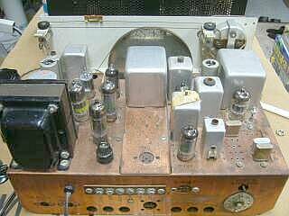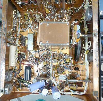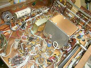 2台目、平滑用コンデンサ追加の様子 オリジナルのブロックコンデンサは、絶縁はOKですが完全な容量抜け状態でした 100μF x2 10μF x2 のところを、手持ちのチューブラー型 100μF と、 40μF でもって対応しました シャーシの高さが高い(深い)ので、これらの収納には困りません 写真下のごちゃごちゃがそのコンデンサです 面倒なので、容量抜けのオリジナルはそのままにしています 外観の錆などに比べ、シャーシ内部はとてもきれいです |