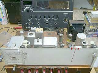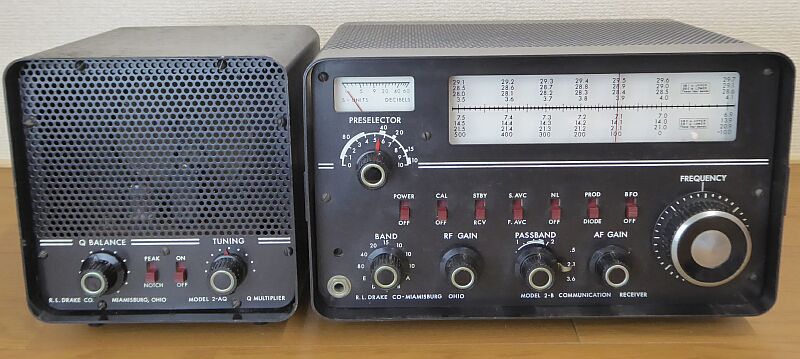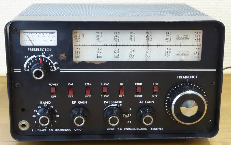 | 特徴的なのは、横行きダイヤルの採用 Drakeとしては珍しいデザインです(多分 Drake2-A、2-Bのみ) 1stIFが、3.5〜4.1MHz それを455KHz、そして50KHzに落として必要な選択度を稼ぎます もちろんプロダクト検波器を内蔵、パスバンドチューニングもついた本格的なものです ダイヤルの読み取り精度は5KHz程度、さすがに1KHz直読とまではいきません スケールの補正はスケールそのものを左右に動かします(FREQUENCYツマミ上の、少々色あせたポチを持って動かします) 本機は、10球構成(整流管を含む)ですが、この後発売の2-Cでは、デザインも大きく変わり、一部が半導体化されました(真空管も、6V管から12V管に変更) RF/AF GAIN PASSBAND ツマミ以外のツマミは、純正ではありません 再調整しましたが、現状ではバンド水晶の問題で、3.5/7MHz帯、19.4〜20.0MHzの受信しかできません(内蔵してあった14MHz帯用バンド水晶発振子は発振していないし、21・28Mバンド用は行方不明! 19.4〜20.0MHzのEバンド設定がしてあったのも、前ユーザーの行い)が、受信動作そのものは正常に動作しています(Drake独特?の、ちょっと濁った感じの当時の音がします:電源の平滑コンデンサの容量抜けにも原因がありそう) バンド水晶を用意すれば、ソケット数に制約がありますが、600KHz単位で30MHzまで受信が出来ます |