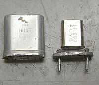 発振していないHC-6/Uクリスタルは、強引にケースを分解して、入手しやすいHC-49/Uのクリスタルを半田付けして使用しています 写真右が、発振しないオリジナルを分解したもの 写真左が、新たに入手したクリスタルを半田付けしたもの この後、外ケースを被せてから、2-Bに装着しました |