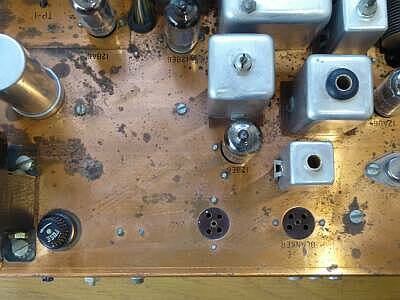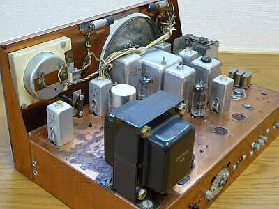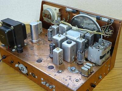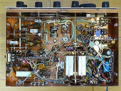 ケース内部 シャーシですが、上面はかなり痛んで(錆びて)いますが、動作に直接の影響はありません 真空管が減っただけシャーシ上には余裕があります ダイヤルは、糸掛け駆動です 電源トランスからフロント・パネルにかけて、シャーシ上は何もありませんが、シャーシ下にはサブボード(基板)が配置されています 半導体化された部分です(シャーシ下写真参照) |