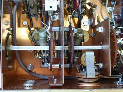 21〜28MHz帯の感度が得られない原因 バンド切り替え、正確に言えばRF側のコイル切替がきちんとできていないところにその原因がありました 最初は、単に接点の接触不良かと思ったのですがそうではなく、軸に付いた接点を動かす板の位置がずれて不適切なことが原因でした こんなことってあるんですね!? しばし悩みました! 左写真中央の部分です |