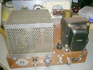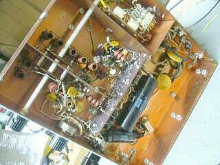 シャーシですが、2-B同様上面はかなり痛んで(錆びて)いますが、こちらも動作に直接の影響はないでしょう(左写真は、リアから写したもの) 真空管は3球構成で、シンプルかつコンパクトに作られている様子がおわかりいただけるでしょう シンプルであっても、メーターにはメタルのシールド・カバーが付けられています 本機は、固定バイアスが採用されていますので、水晶を挿入せずに送信しても、何ら問題は生じません セルフ・バイアスは、この点が怖い! キーイングも、バイアス・コントロールです また、固定Cながらファイナルの中和も取ってあります(真空管メーカーによって、値を変えるよう指示があります/回路図) |