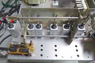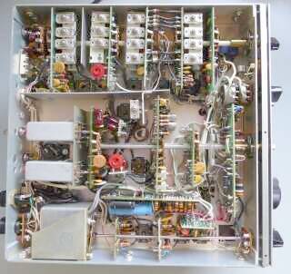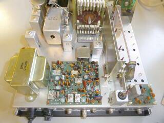 こちらは、シャーシを上から撮したもの ほぼ中央に見える真四角な物体が、4ポールの5645KHz ラティス型フィルターです その右横に見えているφ6通信用ジャックは、ループ・アンテナ(150KHz〜1600KHz用)の接続用端子です