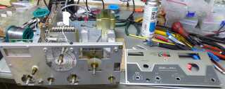 散らかった作業テーブルの上でですが、本格的な分解清掃です(いつものことですが、本業途中の気分転換、思いつきで作業スタートです) アルコールが活躍します スポンジ類の劣化が著しい・・・ゴム類も、です 代替できるところは、手持ちのパーツを活用します 今回で言えば、メイン・ダイヤルの周波数校正時に袴を押さえて目盛板を固定してダイヤルを回して周波数を合わせるのですが、このための押さえであるブッシングの代替調達に苦労しました |