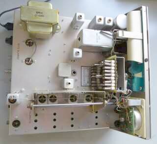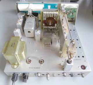 本機ですが、バンド・クリスタルの追加装着以外に、オプションの装着はありません ノイズ・ブランカ、マーカーが、一般的なオプション 電源トランス右に、ジャンパー同軸が見えているところが、ノイズ・ブランカ装着部です 右下角地のソケットが、マーカー・オプション装着部です ほかに、テレタイプ・アダプタ、T-4・T-4X送信機接続(トランシーブ)アダプタ、DCコードがオプションとしてあったようです(NB以外、必要があれば自作できそうです) |