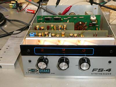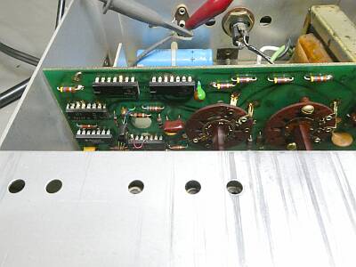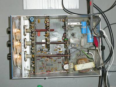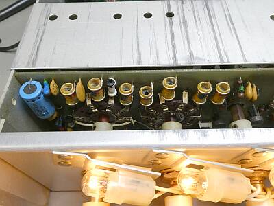 シャーシ上面 修理のためケースから取り出して、シールド板を外したところです 故障不動品(正しい発振出力が得られない)ということで入手したものです (上部に写って見えるのが外したシールド板) マザーボードに基板が3枚立っている形状です |