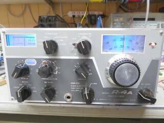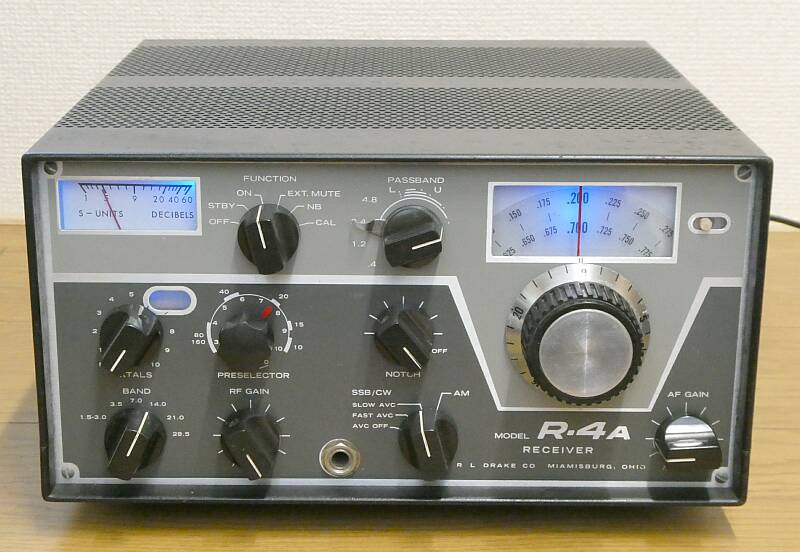 | R-4A 1965年の発売 DRAKE 4ラインとして名を馳せた、受信機のひとつです その前に、R-4という製品がありましたが、2-NTと同じ時代と言うことでR-4A後期モデル(66年発売)としました R-4Aですが、発売から約1年後にマイナー・チェンジがあったようで、65年11月と66年10月では、例えば使用している真空管の数も2本異なります このもののシリアルは、6000番台で、同型後期のものです 真空管の利用は11本で、初期型の13本より2本少なく、それだけ半導体化が進んでいます R-4A初期モデルの13球というのは、R-4と同じ陣容です 後期のR-4Aは、むしろR-4Bに近い内容です(R-4Bでは、PTOにFETの採用がなされていますが、R-4Aでは全てバイポーラ・トランジスタです) メイン・ノブもR-4Bと同じデザインのものが採用されています 余談ですが、R-4BではVFO(DRAKEの表現ではPTO)のたすき掛け運用が取り入れられ(先進的!)、そのためにどのVFOが稼働しているのかをランプ点灯で一見して分かる仕組みが取り入れられました R-4A/T-4Xの時代には、この「たすき掛け機能」はありません この新機能以外の受信機としての基本動作は、このR-4A後期型とR-4Bでは、ほぼ同一ということになります(細かくはR-4Bでは、マーカー発信部が半導体化された、AF回路の半導体の使われ方が変わった、定電圧放電管が省略された、などがあります) R-4Bに続き、R-4Cが発売され、これが DRAKE 4ライン の最後となりました |