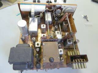 50年という歳月を越え、年代を感じる錆やら汚れが目に付きます 少々の掃除では輝きを取り戻すまでは至りません バンド水晶は、AUX 10バンドの内、5バンドが装着してありました 標準の5バンドの加え、1.5〜2.0MHz 9.5〜10.0MHz 28MHz帯フルカバーのための3バンドの(標準装備は、28.5〜29.0MHzのみ)合計5バンドが追加されています 電源トランスとバンド水晶の間にあるBOXは、パス・バンド・チューニング部が収納されているものです |