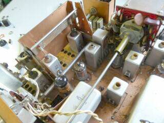 4ラインの特徴のひとつである、RF部の同調機構 可変μ方式です(俗に言われるギロチン) Collinsあるいは、国産では後に発売されたFT-101が採用している方式です HF帯どこででも同調/運用が可能・・・を目指したもの、そして送信機に於いては、中和バランスが崩れない方式ということでの採用かと思われます 余談ながら、同じDRAKE4シリーズでも、トランシーバ/TR-4のRF同調回路は、一般的なVCを使ったもので、μ同調機構は採用されていません あくまでアマチュア無線用・・・なのでしょう 手前に少し見えているシールド部は、PTO・・・やはり可変μ方式を採用したVFO部です 間の小さいシールド部は、50KHz IFノッチ部で、その奥にシャフトで繋がっている先は、パス・バンド・チューニング部です |
