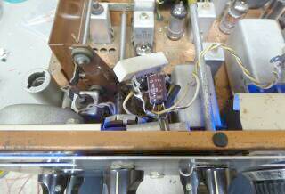照明ランプのLED化 この受信機では、単純には出来ません 理由は、真空管ヒーター電圧12.6Vと6.3Vの混在の中で、印加電圧は12.6V・・・3本の6.3V管の利用に関して、この照明ランプ2本で0.3Aの消費と言うことが計算に含まれています そこで0.3A分を固定抵抗で消費してもらい、表示LEDについては、中間の6.3Vを半波整流した約8Vの電圧を得ることで対応しました 写真は、実験中の様子です メーター照明ランプのところで小細工しています 7Wセメント抵抗と平滑コンデンサが良く見えます 今回の例では、LED化は省エネには繋がりません |