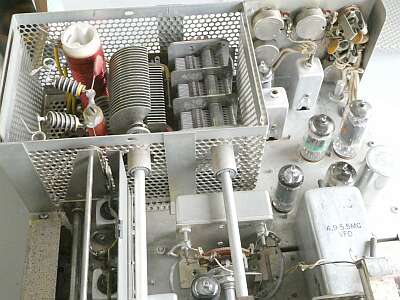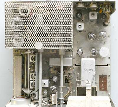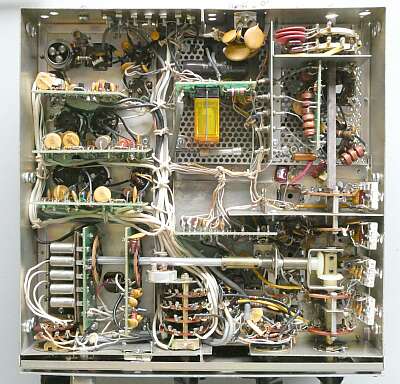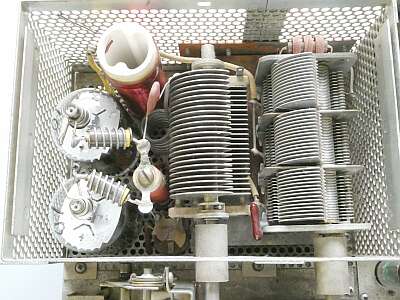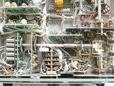バンド切替SW ベベルギアを使って90度ひねってあります 左は、ヘテロダインオシレータ、プリミックス部です 右上は、終段部 |