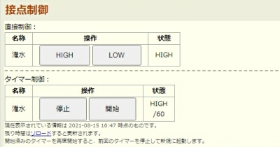 接点制御を潅水目的に特化したもので、現状は左の画面にあるように、手動ON/OFFと、設定で指定したタイマ動作ですが、プログラムの対応で1日3回の60分の潅水、というような設定もできます