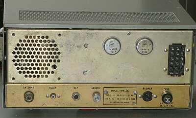 右から、ヒューズホルダ、冷却ファン接続ジャック、アース端子、電鍵(キー)端子、リニアアンプ・スタンバイ端子、アンテナ接続端子 |