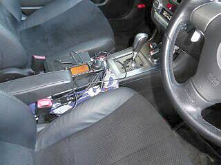 接続ケーブルは、センター・コンソールに沿わせて下ろし、フロア・カーペットの下に隠して(DCコードと一緒に)運転席下まで引きました |