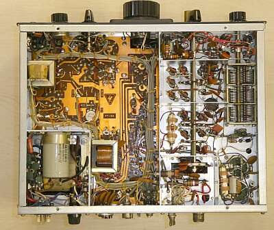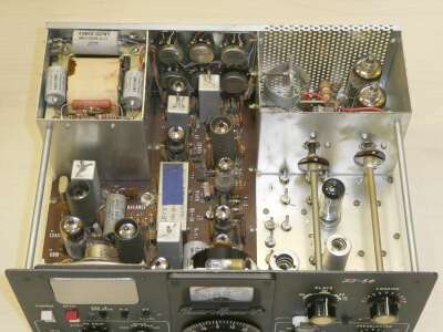 リアパネルを外して写してみました 終段12BB14x2が見えます プレート電圧は300V程度ですので、プレート同調VCも受信機用のVCが使ってあります 電源トランスには、DC−DC用の巻き線が用意してあり、外部に発振用のトランジスタとトランスを用意すれば、DC運用ができるように設計されています |