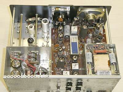 シャーシ上面をリアパネル側から写しました 清掃するときれいになりました 中央にメーター、スピーカーが内蔵されている様子が見てわかります |