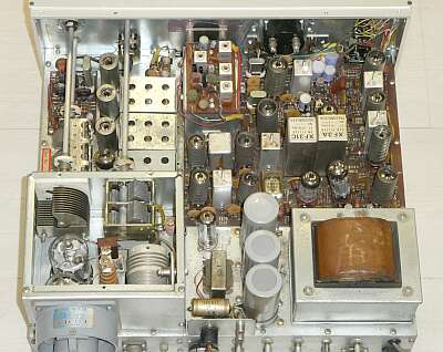 シャーシ裏面です FT-101のような、RF部のシールドパネル(蓋)はありません コイル群は、シャーシ上面でシールドされた中に収納されています |