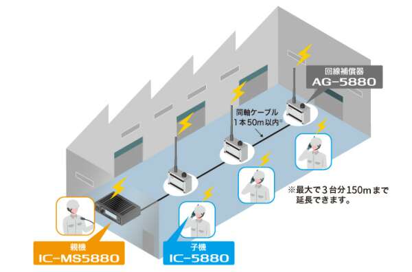 回線補償器(AG-5880)を使用すれば、最大150mまで親機の範囲を延長できます