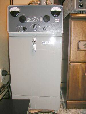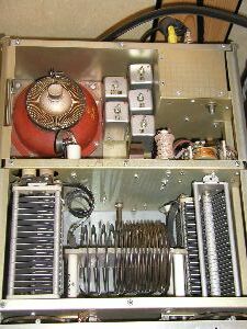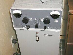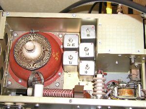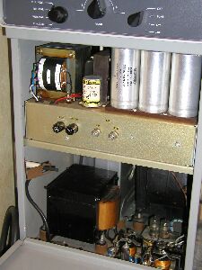 メンテナンスのために開いたときの 写真をいただきました この頃は、お得意のバリLではありませんね それでも高調波の少ないπL型の設計です 電源部には、スウィング・チョークが見えます (50Hzと60Hzでは、定数が異なります) 交流周波数に同期を取って、高圧電源電圧を 安定に供給するための工夫のひとつです 機能美にあふれています |