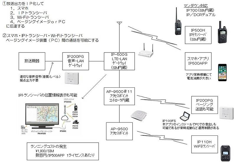 あるものを使って・・・すなわちローコストに仕組みを組み立てるには、知恵と工夫・・・運用も含めてですが、とても大事なことです アナログ装置・・・上記の場合は放送機器との接続ですが、良い音で適切なレベルでIP200PGと接続する、電気屋さんの仕事があります ランニングコストの発生は、 LTE-LANゲートウェイ(1台)と、IPトランシーバ いずれも、SIMにかかる通信費で、1台あたり月額¥1,800(税別) そして、スマホアプリ(月額:数百円/台)です |