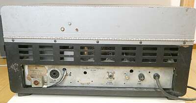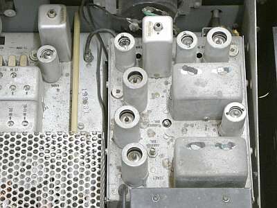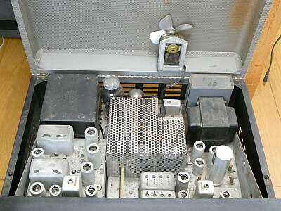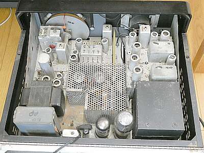 冷却ファンが上蓋に用意されています 上に熱を排気(逃がす)・・・です 左上の黒い物体が電源トランス 右上には、チョークトランスと、その奥は高圧用平滑オイルコンデンサー(1000V10μF)が見えます このあたりで年代が想像できます |