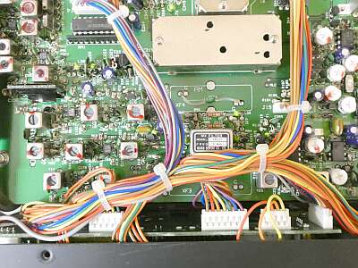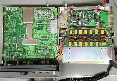 蝶番を起こすとこのようになります 右部分・・・本体上側半分・・・上写真のヒートシンクが見える部分の裏側ですが、こちらは送信ファイナルとフィルタ部です メイン基板は、左部分…本体下側半分ですが、こちらは基板裏面です |