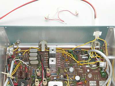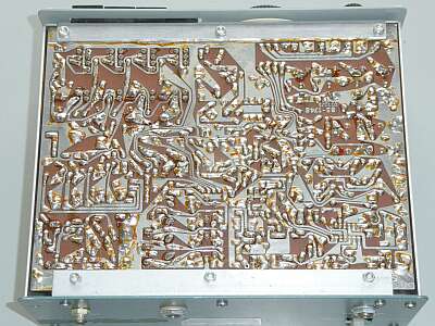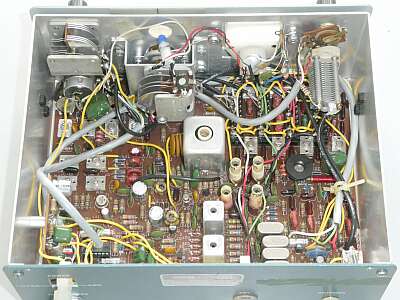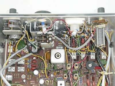 上ケースを外して写したもの フロントパネル右のVCは、送信ロード調整用 同左のVCは、受信RF部の同調用(プリセレクタ) 中央のVCが、250KHzをカバーするVFO用です |