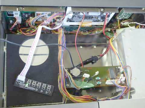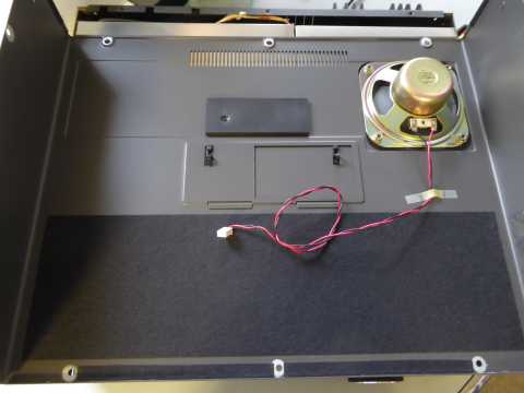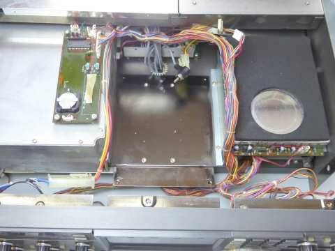 上蓋にある小窓の下・・・時計用バックアップ電池などは、同じ位置ですがずいぶん奥(下)のほうに移設となりました(CRTユニットを外したもので) |