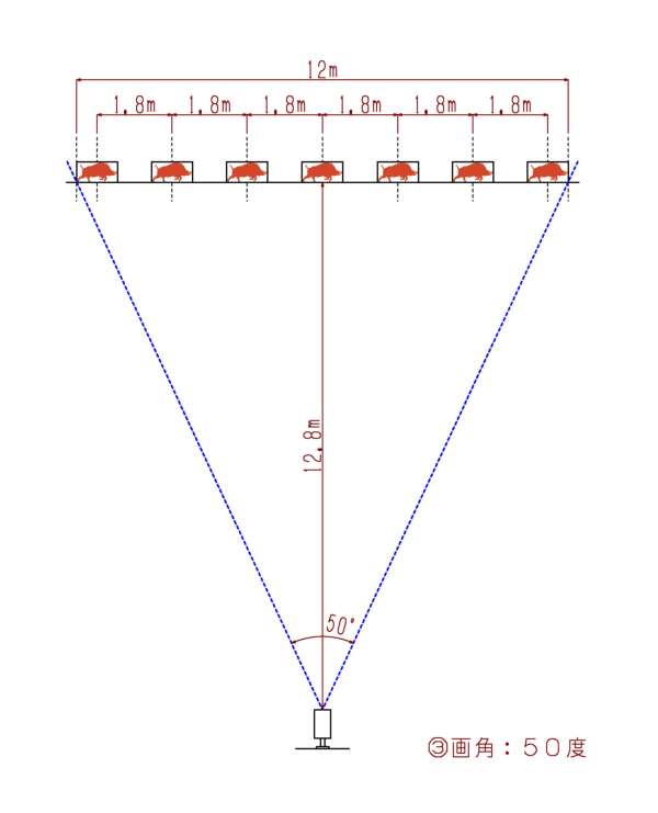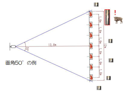 同じカメラで、画角100°に設定すれば、距離5m先で12m巾の監視が出来ます |